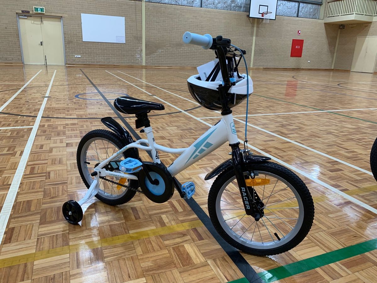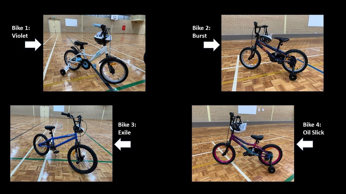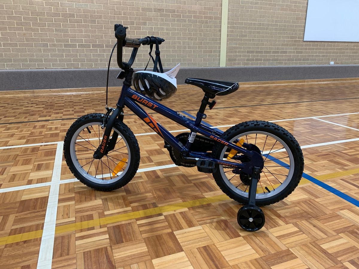 - Bike 2: Model - Burst. Wheel size - 40cm (16"). Rear coaster brake and front calliper brake. Removable training wheels. Bike helmet. Recommended for rider age 4+ years, minimum height 97cm.
