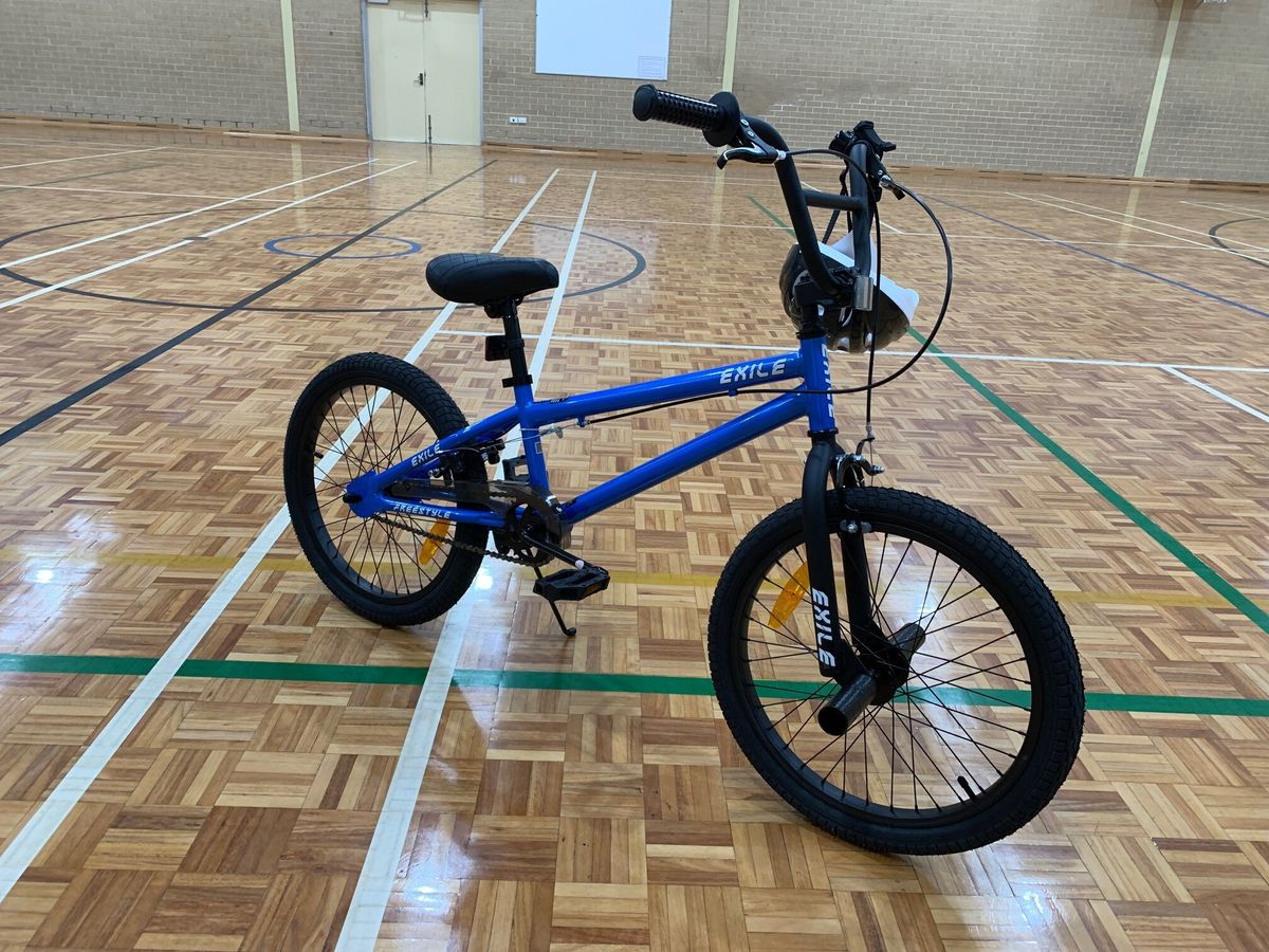 - Bike 3: Model - Exile. Wheel size - 50cm (20"). Comfortable spring seat. Single speed. Rear U brake and front calliper brake. Grey transparent chain guard. 2 stunt pegs. Bike helmet. Recommended for rider age 8+ years, minimum height 122cm.