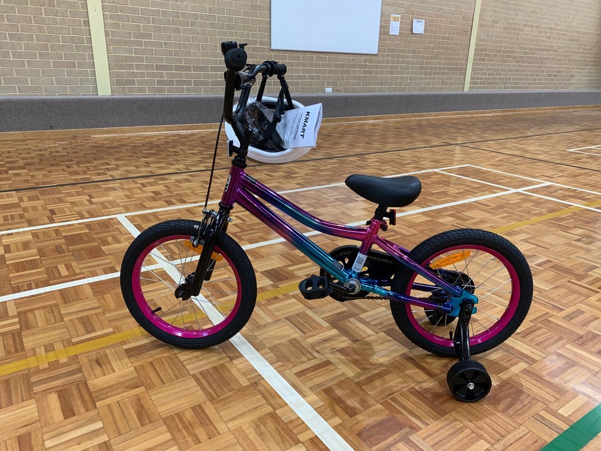 - Bike 4: Model - Oil Slick. Wheel size - 40cm (16"). Oil slick finish on the frame. Double cycle chain guard. Removable training wheels. Bike helmet. Recommended for rider age 4+ years, minimum height 97cm.