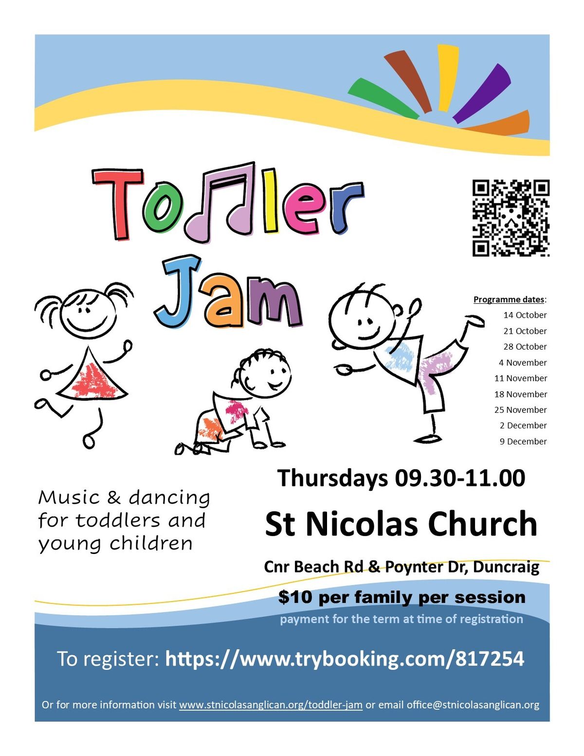 St Nicolas Anglican Church in Duncraig is excited to be starting Toddler Jam in Term 4. Toddler Jam is a structured, friendly music and dance programme for children aged 0-5 years. Parents or grandparents can enjoy a special themed music session with their little ones and then relax with a cup of tea/coffee while our WWCC-checked volunteers supervise playtime for the children.