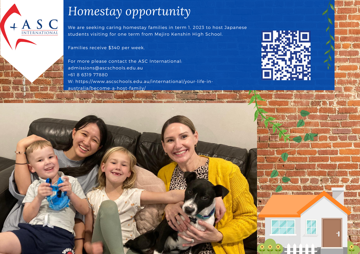 ASC International is seeking homestay families to host Japanese students for Term 1, 2023. Families receive $340 per week.