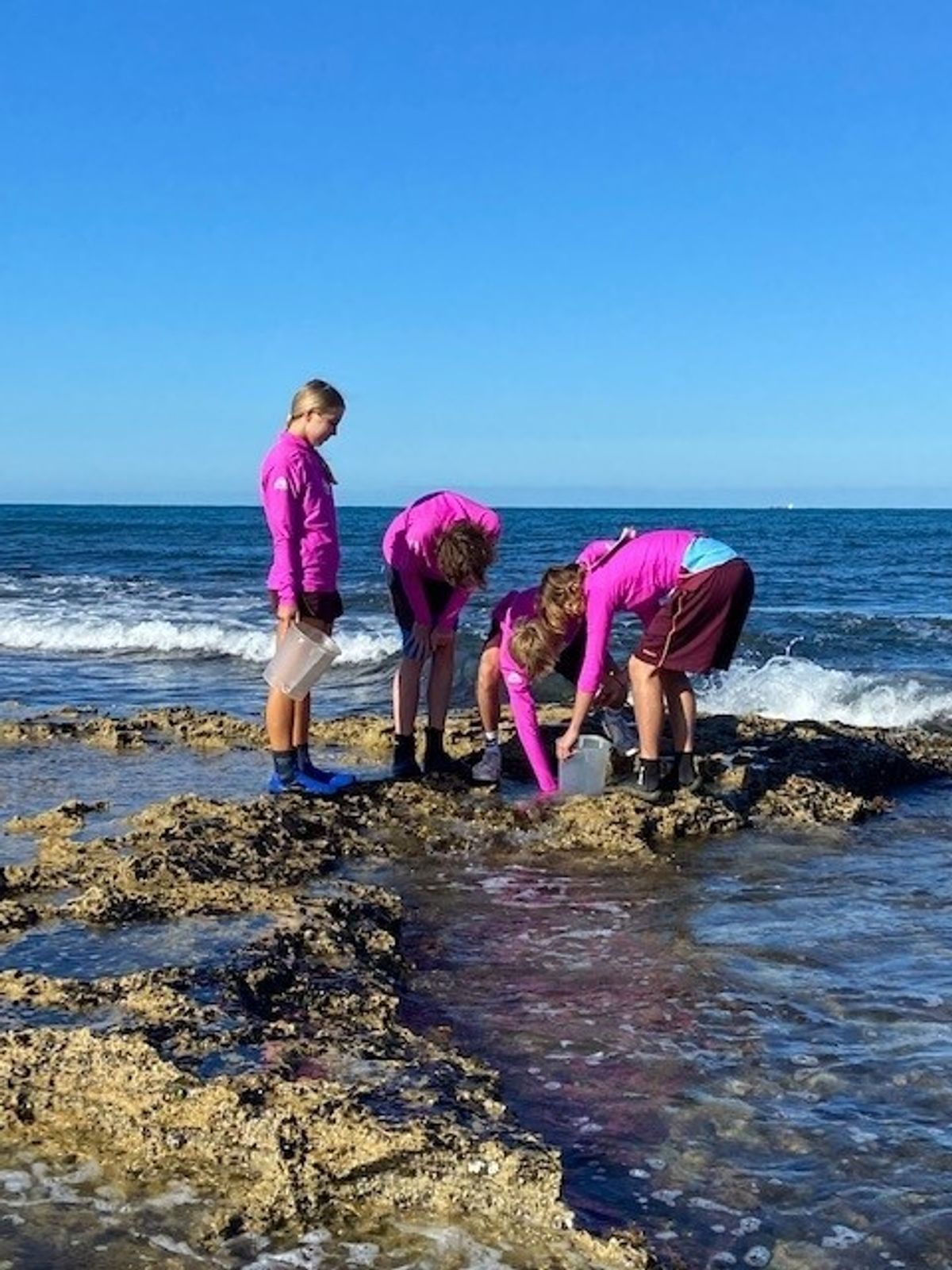 This morning the Year 12 Marine Studies students teed up with the Department of Fisheries to conduct reef platform surveys. The students were required to lay transects, use quadrats and collect data regarding species abundance and composition. It was an early morning but a great way to start the day!