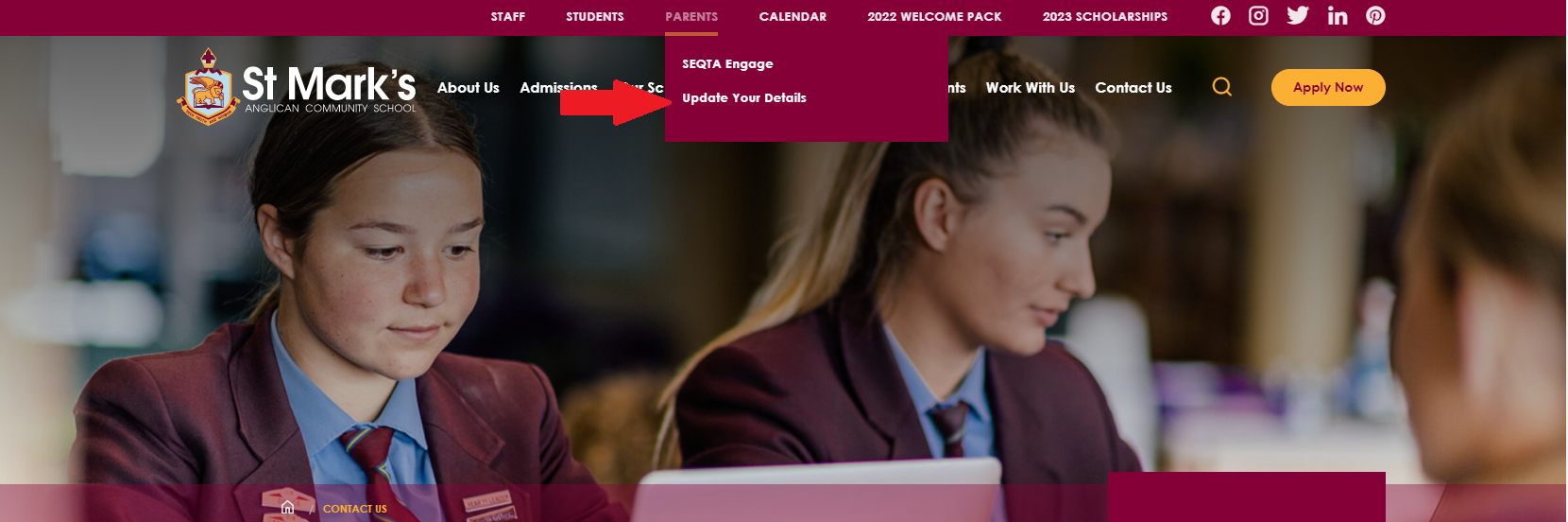 Website: Click on the word PARENTS in the maroon header located at the top of any page of the website. A drop down menu will appear where you can click on the Update Your Details link, then follow the prompts.
